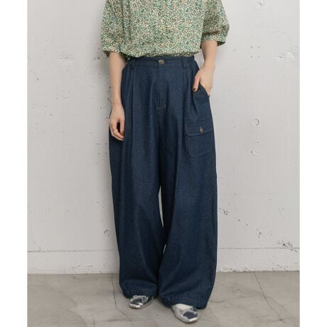 フロントのタックと脇のカーブで丸みのあるシルエットを描いたカーゴパンツ。高密度のウェザークロスとデニムで仕立てました。フラップ付きのお茶目なポケットもポイントです。裾の紐を縛るとシルエットの変化を楽しめます。ウエストは脇から後ろにかけてゴム仕様。体のラインを拾わずリラックス感のある履き心地です。両サイドポケットつき。