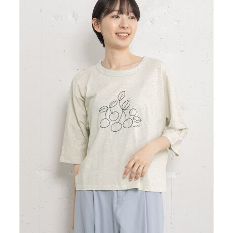 身頃続きの袖でゆったりとしたサイズ感が着やすいドルマンスリーブのトップス。フロントには手描きのベリーモチーフを刺繍しました。ザクザクとしたハンドステッチのようなミシン刺繍がラフな雰囲気。着丈は長すぎず、真っ直ぐな裾のラインですっきりとした印象です。合わせるボトムスも選ばず、デイリーに活躍してくれる一枚です。