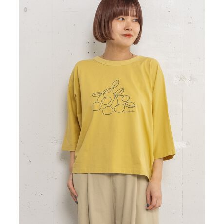 身頃続きの袖でゆったりとしたサイズ感が着やすいドルマンスリーブのトップス。フロントには手描きのベリーモチーフを刺繍しました。ザクザクとしたハンドステッチのようなミシン刺繍がラフな雰囲気。着丈は長すぎず、真っ直ぐな裾のラインですっきりとした印象です。合わせるボトムスも選ばず、デイリーに活躍してくれる一枚です。