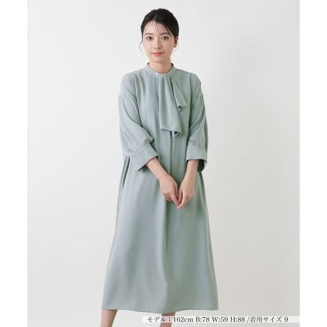 クラシカルな気品とモダンな抜け感が同居する、ボウタイデザインのフレアワンピースです。フロントに配したタイは、結ぶ手間なくいつでも完璧なシルエットをキープ。上品な華やぎを添えつつ、すとんと落ちるロング丈のラインが大人の佇まいを演出。肌離れの良いやや薄手の生地には、初夏の着こなしに嬉しいストレッチ性をプラスしました。バックファスナー仕様で着脱もスムーズに行え、実用的なポケットを備えているのもポイント。手首をのぞかせる絶妙な袖丈とフレアの広がりが、歩くたびに優雅なニュアンスを描き出します。
