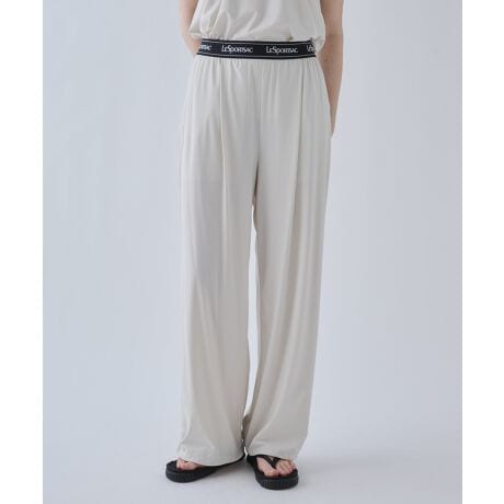 フロントのタックが広がりを抑え、腰まわりをすっきり見せてくれるデザインです。ウエストはブランドロゴ入りのゴム仕様で、ラクなはき心地とさりげないアクセントをプラス。