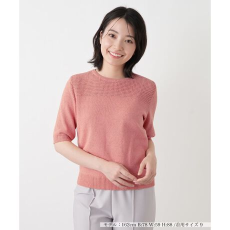 繊細な煌めきを放つ、ラメ糸を織り込んだ半袖ニットトップスです。クルーネックから胸元にかけて施された透かし編みの切り替えが顔周りを涼やかに演出。ひと手間加えた表情豊かなデザインが、大人の女性の気品を醸し出します。程よく身体にフィットする伸縮性に優れた編地で、ストレスフリーな着心地を実現しました。コンパクトなシルエットがボトムスを選ばず、デイリーからオフィスカジュアルまで多彩なシーンで活躍する一枚です。