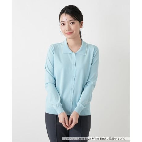 襟元に繊細なパール調ビジューをあしらった、清楚な佇まいのカーディガン。第一ボタンにのみ大粒のパールを配し、顔周りを華やかに演出する上品な一着に。レーヨンにナイロンをブレンドしたニットは、滑らかな肌触りと適度な落ち感がポイント。初夏の羽織りとして重宝するやや薄手のニットでさらりと快適に着用いただけます。コンパクトな襟付きのシルエットがきちんとした印象を与えつつ、柔らかなカラーリングが女性らしさを引き立てます。オフィスカジュアルからデイリーまで対応し、大人の日常に寄り添うアイテムです。