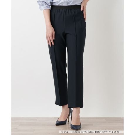 スマートなシルエットと快適な穿き心地を両立した、アンクル丈のテーパードパンツです。フロントに施されたセンターシームが縦ラインを強調し、脚長見せ効果を演出。裾のサイドスリットが足元に軽やかな抜け感をプラスし、初夏のスタイリングにふさわしい涼やかな印象を与えます。ストレッチ性を備えたやや薄手の生地は、身体の動きにしなやかにフィット。ウエストには総ゴムベルトを採用しているため、長時間の着用でもストレスを感じさせません。汎用性の高いミニマルなデザインなので、デイリーからオフィスまで幅広いシーンで活躍します。