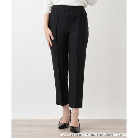 スマートなシルエットと快適な穿き心地を両立した、アンクル丈のテーパードパンツです。フロントに施されたセンターシームが縦ラインを強調し、脚長見せ効果を演出。裾のサイドスリットが足元に軽やかな抜け感をプラスし、初夏のスタイリングにふさわしい涼やかな印象を与えます。ストレッチ性を備えたやや薄手の生地は、身体の動きにしなやかにフィット。ウエストには総ゴムベルトを採用しているため、長時間の着用でもストレスを感じさせません。汎用性の高いミニマルなデザインなので、デイリーからオフィスまで幅広いシーンで活躍します。