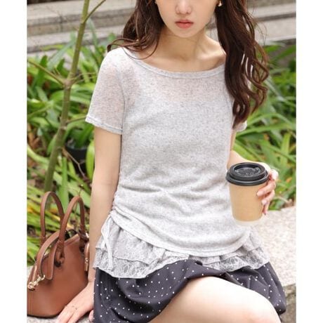 人気アイテムが半袖になって登場!清涼感のあるメランジシアーカットソーと裾レースフリルキャミソールのセットアイテム。トップスはボートネックでワンショルダーにもなり、抜け感のある着こなしが楽しめます。サイドのドロストで着丈調整可能。インナーは程よい厚みのフライス素材に繊細なレースを施し、フェミニンさをプラス。ワイドデニムやカーゴパンツと合わせて甘辛ミックスなY2Kスタイル、ミニスカート×ロングブーツでフェミニンコーデもおすすめです。※モデルの着用画像の場合、光の当たり具合により、実際の色味と異なって見えることがございます。色味は、商品単体の画像をご参照ください。