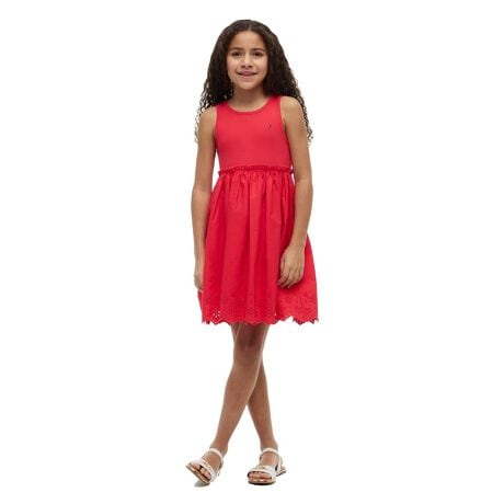 お花のようなカットワークが施されたレース使いがキュートなノースリーブワンピースです。身頃部分には着心地の良いカットソー素材を使用しました。胸元にフラッグロゴのワンポイント入り。デイリーユースにはもちろん、リゾートシーンやお出かけにも着ていただけます。