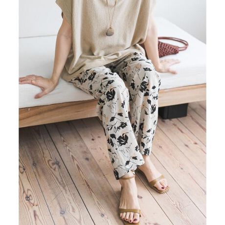 モノトーン調のシックなフラワープリントが目を引く、存在感のあるイージーパンツは、大人のリラックスコーデの主役として取り入れたい一着。
