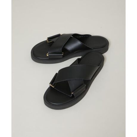 ・金色のバックルと交差したベルトが特徴のレザーサンダル