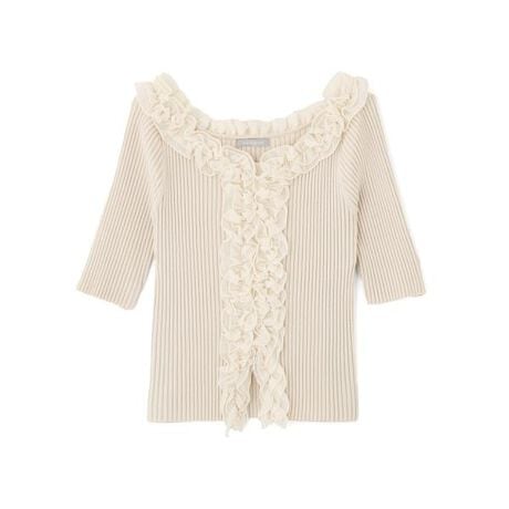人気トップスから半袖が登場!衿ぐりと前立てにシフォンのボリュームフリルをトリミングした華やかな半袖ニット。細身でほど良くフィットするリブニットと布帛フリルのコントラストがポイント。ほど良いデコルテ開きで首元をキレイに見せつつ、フリルにボリュームがあるので肩紐を気にしないで着られます。※撮影時照明の関係により、色味が違って見える場合がございます。またパソコン・スマートフォンなどの環境により、若干製品と画像のカラーが異なる場合もございます。予めご了承ください。商品の色味は、商品単品画像をご参照下さい。※商品画像はサンプルのため、色味やサイズ等の仕様に変更がある場合がございますので、予めご了承ください。