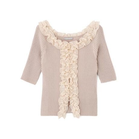 人気トップスから半袖が登場!衿ぐりと前立てにシフォンのボリュームフリルをトリミングした華やかな半袖ニット。細身でほど良くフィットするリブニットと布帛フリルのコントラストがポイント。ほど良いデコルテ開きで首元をキレイに見せつつ、フリルにボリュームがあるので肩紐を気にしないで着られます。※撮影時照明の関係により、色味が違って見える場合がございます。またパソコン・スマートフォンなどの環境により、若干製品と画像のカラーが異なる場合もございます。予めご了承ください。商品の色味は、商品単品画像をご参照下さい。※商品画像はサンプルのため、色味やサイズ等の仕様に変更がある場合がございますので、予めご了承ください。