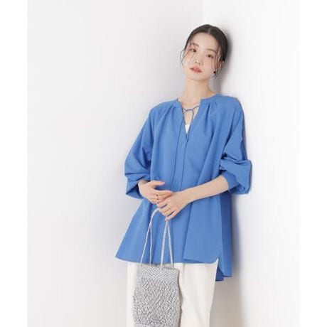 リネン混素材のナチュラルな風合いが魅力のプルオーバーブラウス。洗濯機洗いが可能なイージーケア仕様で、デイリーに取り入れやすいアイテム。ボリューム感のあるドルマンスリーブと、襟元のリボンディテールが大人カジュアルなスタイルにさりげないアクセントを添えてくれる1枚です。