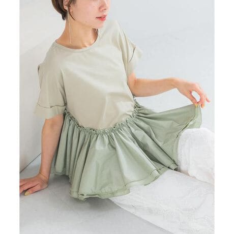 Tシャツの気軽さとブラウスの華やかさを兼ね備えた、存在感のあるドッキングトップス。身頃には目の詰まったカットソー素材を使用し、さらりと着られる快適さをキープ。裾部分には光沢と程よいハリのあるタフタ素材を組み合わせ、動きのあるティアードデザインに仕上げました。分量感のあるフリルでも軽やかに見えるよう、軽さのあるタフタ素材を採用しています。サイドがやや上がるカットラインにすることで、横から見たときも立体的で軽やかなシルエットに。後ろ丈は少し長めに設定し、腰まわりをさりげなくカバーしてくれるのも嬉しいポイントです。五分袖デザインで腕まわりをカバーしながら、ロールアップ仕様にすることで甘さを程よく抑えました。一枚で着映えするデザインのため、シンプルなパンツと合わせるだけでバランスよくまとまります。