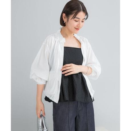 首元のフリルと立体的なフォルムが印象的な、着回し力の高いフロントジップブラウス。適度なハリとナチュラルな表情を持つコットンナイロン素材を使用し、軽やかな着心地ときれいなシルエットを両立しています。首元にはギャザーを施し、さっと着るだけで奥行きのある立体感と華やかさを演出。フロントジップ仕様のためブラウスとしてはもちろん、軽い羽織りとしても活躍します。袖をたくし上げたときに生まれるボリュームスリーブのシルエットもポイントで、程よい抜け感と女性らしいバランスをプラス。裾にはドローストリングを施し、絞ることでシルエットの調整が可能です。シンプルながらもディテールにこだわった一枚で、シーズンを通して幅広い着こなしを楽しめます。