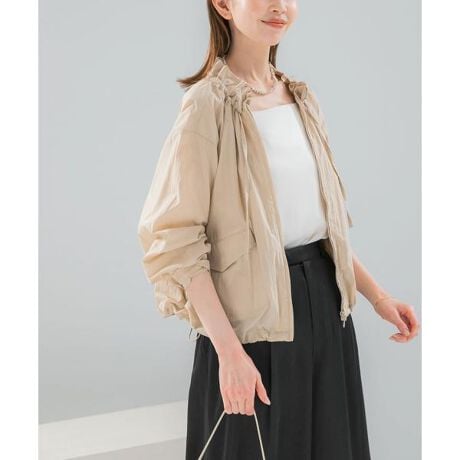 首元のフリルと立体的なフォルムが印象的な、着回し力の高いフロントジップブラウス。適度なハリとナチュラルな表情を持つコットンナイロン素材を使用し、軽やかな着心地ときれいなシルエットを両立しています。首元にはギャザーを施し、さっと着るだけで奥行きのある立体感と華やかさを演出。フロントジップ仕様のためブラウスとしてはもちろん、軽い羽織りとしても活躍します。袖をたくし上げたときに生まれるボリュームスリーブのシルエットもポイントで、程よい抜け感と女性らしいバランスをプラス。裾にはドローストリングを施し、絞ることでシルエットの調整が可能です。シンプルながらもディテールにこだわった一枚で、シーズンを通して幅広い着こなしを楽しめます。