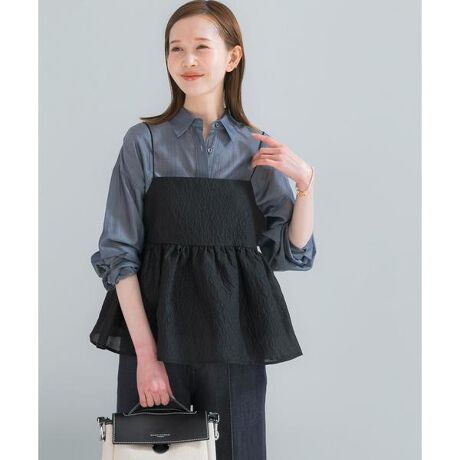 繊細な表情をもつシアージャガード素材が、華やかさを添えるレイヤードキャミソール。程よいハリと軽やかな透け感が特徴で、シンプルなトップスに重ねるだけで着こなしをぐっと洗練された印象へ導きます。胸下の切り替えからふんわりと広がるペプラムシルエットが、女性らしい柔らかなラインを演出。ウエスト位置を高く見せるデザインで、自然とスタイルアップ効果も期待できます。バックスタイルのさりげないリボンディテールが、甘さを抑えながら程よいアクセントに。カットソーやリブニット、シャツなど幅広いアイテムと相性が良く、いつものコーディネートを新鮮にアップデートしてくれます。