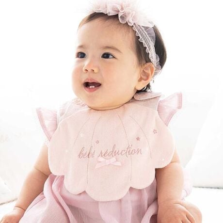 貝殻をモチーフにしたフォルムが愛らしい、お出かけにもぴったりな女の子ベビー用パイルスタイ。