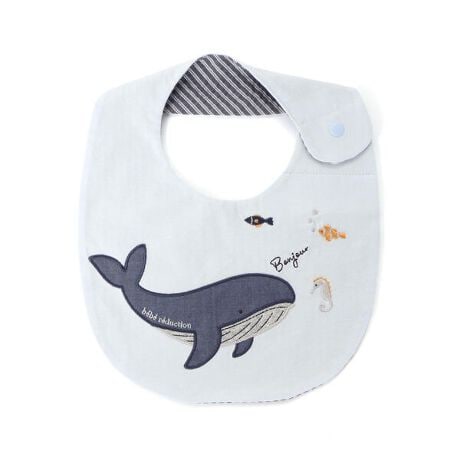 大きなクジラのパッチワークが目を引く、爽やかなマリンデザインの男の子ベビー用スタイです。
