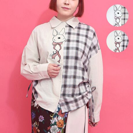 【チェック×無地の異素材切替 リボンウサギ刺繍シャツ】