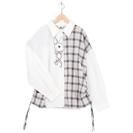 【チェック×無地の異素材切替 リボンウサギ刺繍シャツ】