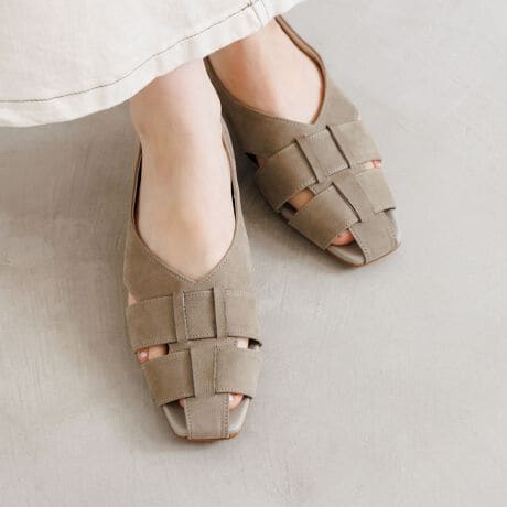 フラットソールで歩きやすく、見た目以上に軽量なため、たくさん歩く日にもおすすめです。つま先をカバーしつつ抜け感のあるデザインは、これからの季節に大活躍。素足ではもちろん、ソックス合わせのスタイリングも楽しめます。