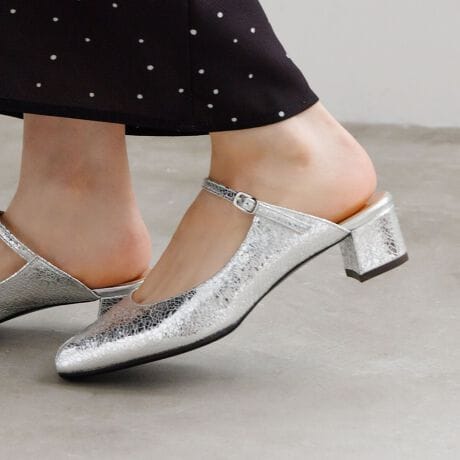 ブラックとアイボリーには、立体的なメッシュ柄の型押しを施し、レザーの上品な風合いを引き立てています。シルバーはクラック箔レザーを使用し、履くだけで足元を華やかに彩ります。抜け感とトレンド感を同時に叶えてくれる一足です。