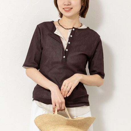 ・フロントはクルーネック、バックはヘンリーネックのデザインで、前後どちらでも着用可能な2WAY仕様