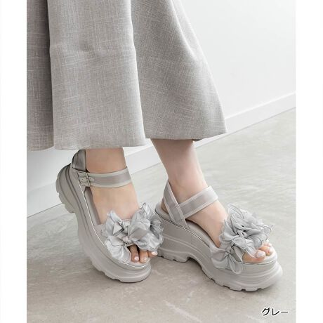 ・シアーとサテンリボンを組み合わせたリボンをランダムにあしらいフリルのように仕上げた女性らしい一足