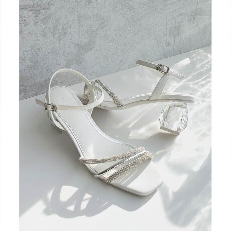 きらめくビジューとクリアヒールが目を惹くストラップサンダル。