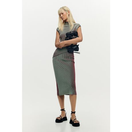 斜めストライプ柄とハイネックのノースリーブニットワンピース。生地は腰の位置で2方向のストライプが交差しており、丈はミディ丈です。