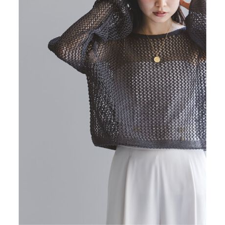 大きめの編地にざっくりと編んだ透け感が可愛いショート丈ニットプルオーバー。