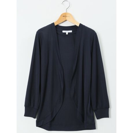 春先から盛夏までロングシーズン着回せる、ボレロタイプの長袖カーディガンです。首筋を隠すことができる後ろ衿の高さと、リブ編みで切り替えた前立てから裾のラインがポイント。外出時の日焼け防止や屋内の冷房対策に便利な一枚です。