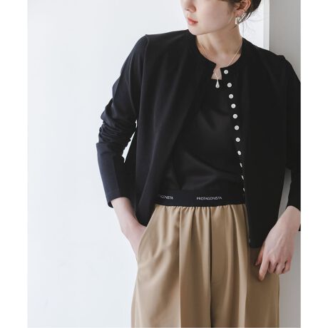 間隔を狭く多めに配置したフロントボタンがさり気ないアクセントになりつつ、プルオーバーとしても羽織りとしても合わせやすい1着。