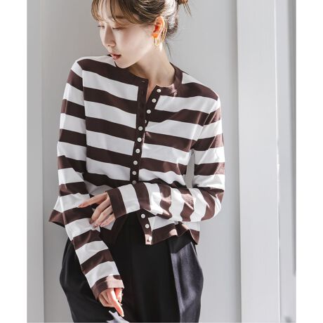 間隔を狭く多めに配置したフロントボタンがさり気ないアクセントになりつつ、プルオーバーとしても羽織りとしても合わせやすい1着。