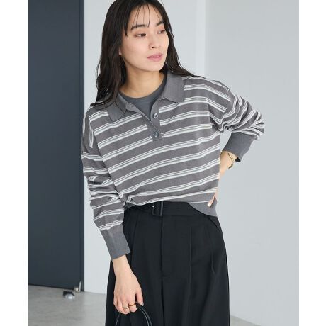 *やさしい透け感で軽やかに仕上げる シアーボーダーポロ衿ニットプルオーバー。■素材・着心地