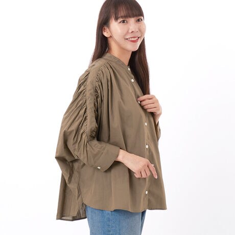 【素材】綿特有の肌触りの良さと膨らみ感が特徴の綿ローンを使ったデザインブラウス。【デザイン】身頃から袖が一続きになったドルマンスリーブのブラウスはゆったりとしたシルエットに肩からふんだんに入ったギャザーで膨らみ感を出しています。薄手の綿素材ながら体のシルエットを拾いにくいパターンでキレイなシルエットに仕上がっています。【ブランド情報】FRAPBOIS/フラボア2001年にブランドスタート。「大人げない大人の服」をコンセプトに、大人が着るリラックスしたデイリーウェアを提案するコレクションブランド。レディースとメンズのアイテムをご用意しています。