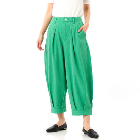 【素材】生地の表面感が凹凸した特殊な生地はサラッとした肌触りと見た目以上の軽やかさがポイント。程よい伸縮性もストレスフリーで◎。【デザイン】フロントに大きくタックを取りヒップや太もも周りにゆとりを持たせたバルーンシルエット。裾にタックを取りシルエットのアクセントをつくっています。生地の凹凸感で伸縮性抜群のパンツはキレイ見えしながらも履きやすいアイテムになっています。*0,1サイズですがこちらの商品はユニセックス商品です。【ブランド情報】FRAPBOIS/フラボア2001年にブランドスタート。「大人げない大人の服」をコンセプトに、大人が着るリラックスしたデイリーウェアを提案するコレクションブランド。レディースとメンズのアイテムをご用意しています。