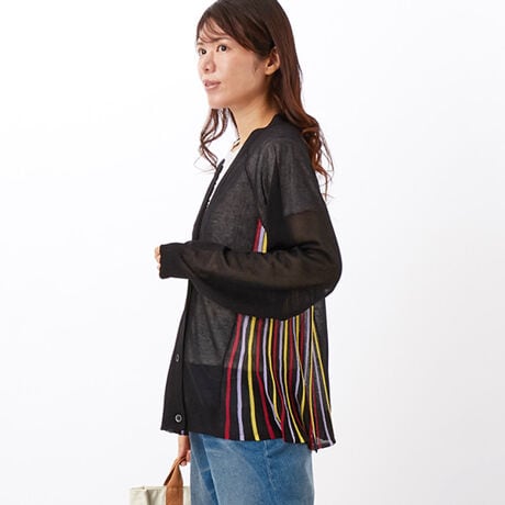 【素材】細番手のドライタッチの糸を使った繊細でシアーなハイゲージニット。【デザイン】両脇にストライプ状のマルチカラーのラインを施したデザインニット。ゆったりとしたAラインのシルエットにスッキリとしたV開きのカーディガン。ラグランスリーブの脇下に立体感のあるカラーラインがキレイなドレープ感を出しています。シアーで光沢感のある編み地は大人見えのするモードな装いも表現しています。【ブランド情報】FRAPBOIS/フラボア2001年にブランドスタート。「大人げない大人の服」をコンセプトに、大人が着るリラックスしたデイリーウェアを提案するコレクションブランド。レディースとメンズのアイテムをご用意しています。