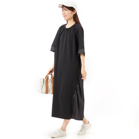 【素材】綿特有の肌触りの良さとキレイな表面感が特徴の天竺素材にサラッとしたタイプライターのシャツ生地を組み合わせたデザインワンピース。【デザイン】袖が身頃と繋がったリラックスシルエットのワンピースは袖や両脇に組み合わせたシャツ生地がアクセントをつくっています。衿周りにはほのかにギャサーを入れ、両脇の切り替えにも膨らみ感を出して立体感のある面白いシルエットを演出しています。同系色系の組み合わせなのでインパクトが有りながらも着やすいアレンジが◎。脇のポケットもさり気なく嬉しいポイントです。【ブランド情報】FRAPBOIS/フラボア2001年にブランドスタート。「大人げない大人の服」をコンセプトに、大人が着るリラックスしたデイリーウェアを提案するコレクションブランド。レディースとメンズのアイテムをご用意しています。