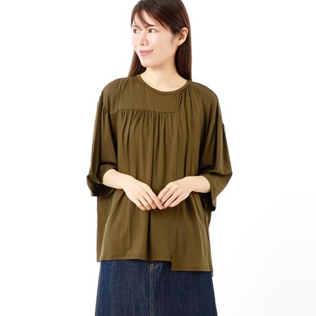【素材】しっとりとした肌触りとほのかな光沢感にキレイなドレープが上品な素材を使ったカットソー。【デザイン】袖や身頃にたっぷりとギャザーを入れ、膨らみ感を出しながらも素材の持つしなやかなドレープ感でまとまりを出したシルエットになっています。フロントの切り替えが左右非対称でさり気ないインパクトをつくっています。【ブランド情報】FRAPBOIS/フラボア2001年にブランドスタート。「大人げない大人の服」をコンセプトに、大人が着るリラックスしたデイリーウェアを提案するコレクションブランド。レディースとメンズのアイテムをご用意しています。