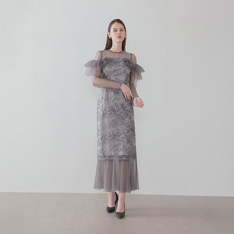 シアーな質感が軽やかに揺れる、スパンコール刺繍のチュールワンピースドレス。