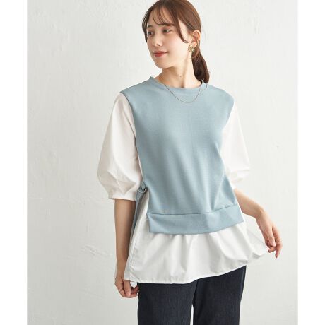 ベストとブラウスを重ねたように見せる、異素材切り替えのフェイクレイヤードトップス。