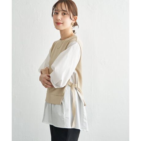 ベストとブラウスを重ねたように見せる、異素材切り替えのフェイクレイヤードトップス。