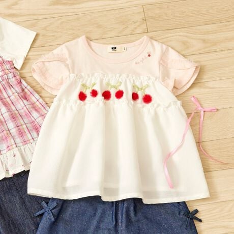 チュールで仕立てたチェリーのモチーフと、アレンジを加えた袖が、デザインポイント。