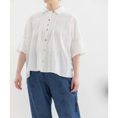 リネン混の繊細な表情がかわいいフラワージャカードブラウス。ワイドな身頃とドロップショルダーの5分丈カフス袖でふんわり着こなせます。カフスは折り返しても使いやすく、ピンタックと第一ボタンを開ければオープンカラー風の優しい襟元に。後ろが長めのデザインで、スカートやパンツにもバランスよく合わせられます。