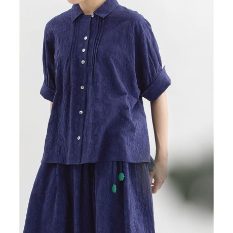 リネン混の繊細な表情がかわいいフラワージャカードブラウス。ワイドな身頃とドロップショルダーの5分丈カフス袖でふんわり着こなせます。カフスは折り返しても使いやすく、ピンタックと第一ボタンを開ければオープンカラー風の優しい襟元に。後ろが長めのデザインで、スカートやパンツにもバランスよく合わせられます。