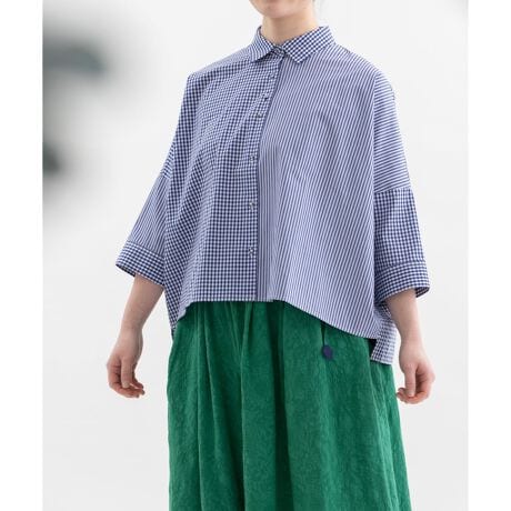ワイドなスクエアーシャツ。同色系の異素材組み合わせがポイントに。脇が垂れるこなれシルエットで、前身丈は短めなのでスカートにもパンツにもバランスよく着られる人気の型。後ろボタン開きの肘にかかる6分袖で、上の方だけボタン間隔を狭くしたデザインで、首元の開きを調整できます。ボタンを開けたときにちらりと見える、下前立ての配色ステッチがアクセント。