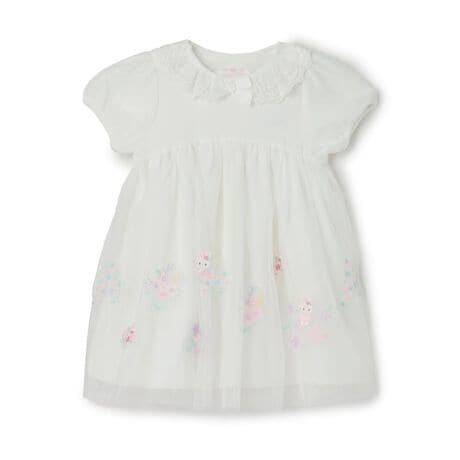 春らしいやさしい色のフラワーブーケとうさぎの妖精を刺しゅうしたチュールドッキングのワンピースです。チュールレースの衿をつけておすまし感をプラスしました。お揃いの生地のブルマつきで、おむつが見える心配がありません。おすわりの多い年齢のお子さまに裾がつきにくいように、80cmはチュニック丈、90cmと100cmはワンピース丈とサイズによって長さを変えているのもポイント。内側にお名前を記入できるタグがついています。
