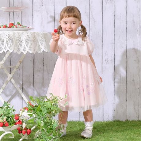 春らしいやさしい色のフラワーブーケとうさぎの妖精を刺しゅうしたチュールドッキングのワンピースです。チュールレースの衿をつけておすまし感をプラスしました。お揃いの生地のブルマつきで、おむつが見える心配がありません。おすわりの多い年齢のお子さまに裾がつきにくいように、80cmはチュニック丈、90cmと100cmはワンピース丈とサイズによって長さを変えているのもポイント。内側にお名前を記入できるタグがついています。