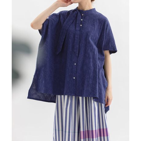 リネン混の繊細な表情がかわいいフラワージャカードブラウス。ワイドな身幅で涼しく、身頃とつながった半袖丈の袖がゆったりしたシルエットを作ります。襟の右と後ろ中心にはタブがついており、取り外し可能なボーを垂らすことができるデザイン。後ろ丈はヒップが隠れる長めの丈で、開けた時にちらりと見える配色ステッチもポイントです。